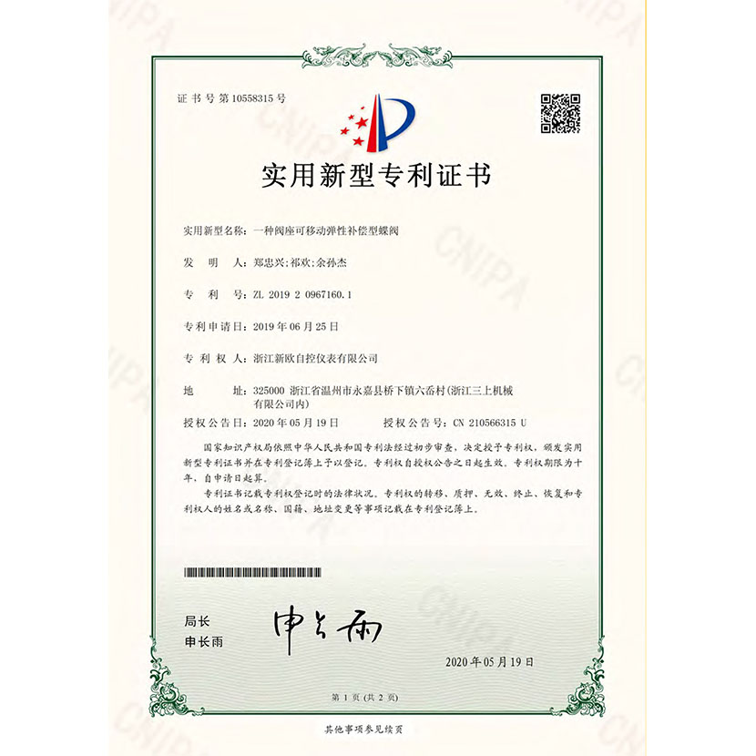 一種閥座可移動彈性補償性蝶閥 專利證書